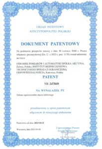 W dniu 09.09.2025 r. na podstawie przepisów ustawy z dnia 30 czerwca 2000 r. Prawo własności przemysłowej (Dz. U. z 2023r., poz. 1170) Urząd Patentowy Rzeczpospolitej Polskiej udzielił naszej firmie ochrony patentowej. Przedmiotem wynalazku jest „Osłona ognioszczelna złącza kablowego”. Rozwiązanie to znajduje zastosowanie w pomieszczeniach zagrożonych atmosferą wybuchową, w szczególności w wyrobiskach górniczych, znacząco podnosząc poziom bezpieczeństwa pracy.